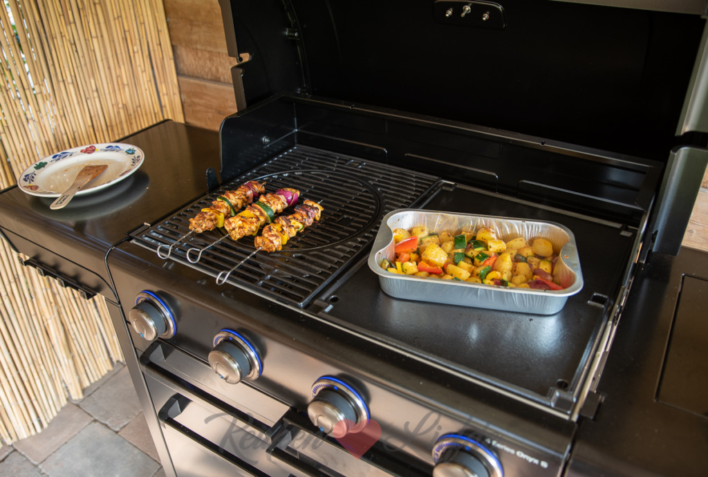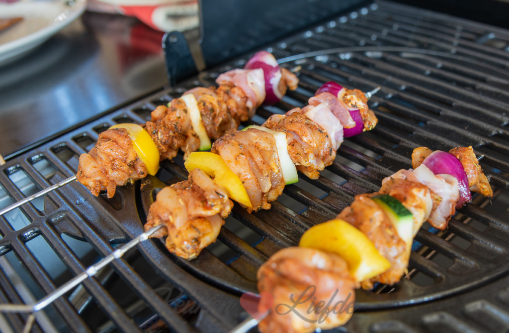 Ik maakte deze kipspiezen op de Campingaz 4 Series Onyx S gasbarbecue die wij onlangs kregen van Campingaz samen met drie accessoires: een paellapan, een rotisserie kit en een pizzasteen. Inmiddels hebben wij de barbecue al goed kunnen testen. Ook de accessoires heb ik allemaal al gebruikt en de recepten die ik hiermee maakte (paella, rotisserie kip en pizza van de barbecue) ga ik binnenkort met je delen. Tot nu toe zijn wij heel enthousiast over de barbecue die vol zit met handige snufjes. Zo zorgt het InstaClean® Aqua ervoor dat de barbecue heel makkelijk schoon te maken is. Het Blue Flame Power System creëert minder vlammen waardoor het eten beter bereid wordt en het ziet er ook nog eens heel tof uit. En tot slot het Culinaire Modulaire Systeem waarbij je een deel van het rooster weg kunt nemen en hier een van de accessoires in kunt plaatsen zoals bijvoorbeeld de paellapan. De barbecue is dus heel breed inzetbaar en eigenlijk meer een complete buitenkeuken dan alleen een barbecue. Wij zijn er heel blij mee!