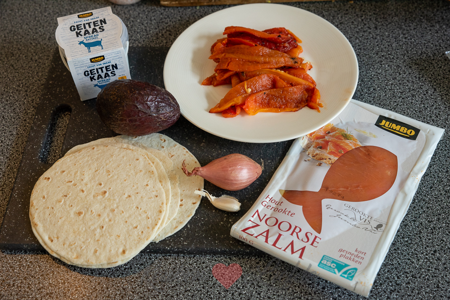 Door de paprika te roosteren krijgt hij een licht gerookte en zoete smaak die perfect past bij de zalm, avocado en geitenkaas.