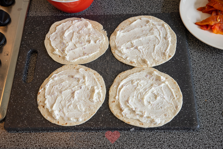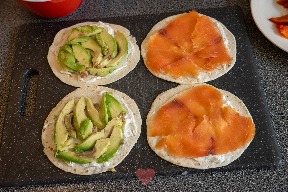 Smeer de geitenkaas over de zes tortillawrap. Beleg drie wraps met zalm en de andere drie met avocado en paprika (en eventueel mango als je wilt). Leg de wraps bovenop elkaar en grill ze op de barbecue, in een hete grillpan, of onder een hete ovengrill circa 8 minuten tot ze goudbruin zijn. Draai ze halverwege de baktijd om.
