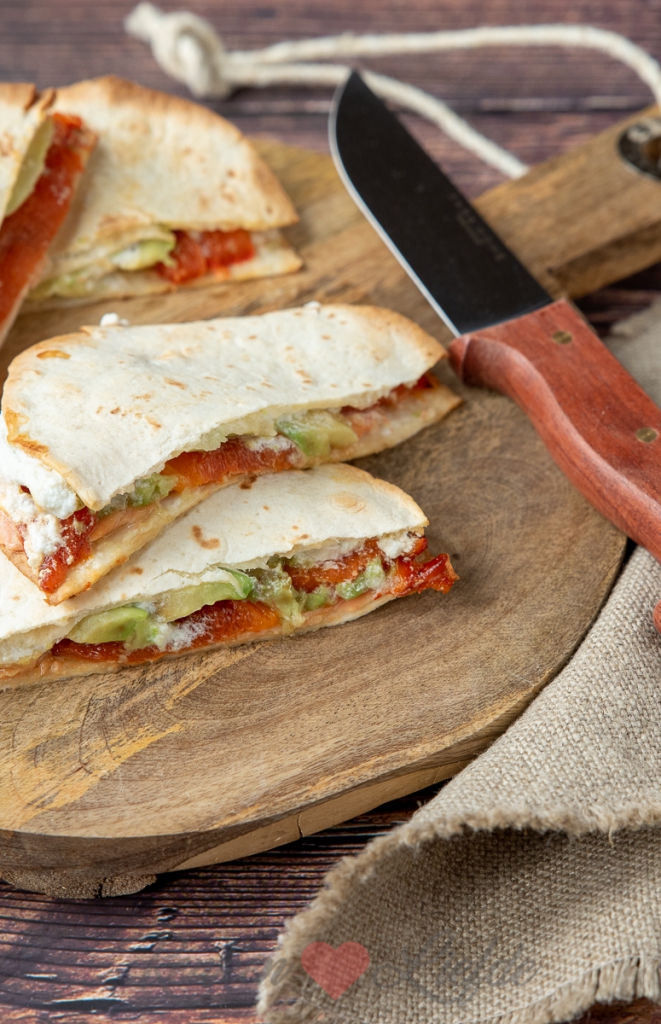 Dit recept voor West Coast British Columbia style gerookte zalm quesadilla’s kreeg ik onlangs doorgestuurd van mijn Canadese nicht Marissa. Canadezen zijn dol op zalm en het is daar een veelgebruikt ingrediënt. In dit heerlijke recept gaat de gerookte zalm in een quesadilla samen met geroosterde paprika, avocado en geitenkaas. Een verrukkelijke combi! Mijn nicht bereid de quesadilla’s op de barbecue, maar je kunt ze ook grillen in de grillpan of roosteren onder een hete ovengrill.
