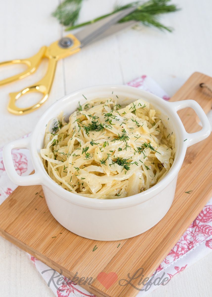 Doe alle ingrediënten én een scheutje water in een hapjespan en doe de deksel op de pan. Smoor de witte kool circa 8 tot 10 minuten, of totdat hij beetgaar is en de mosterdsaus is ingedikt. Roer regelmatig even door. Roer vlak voor serveren de dille door de mosterdkool.