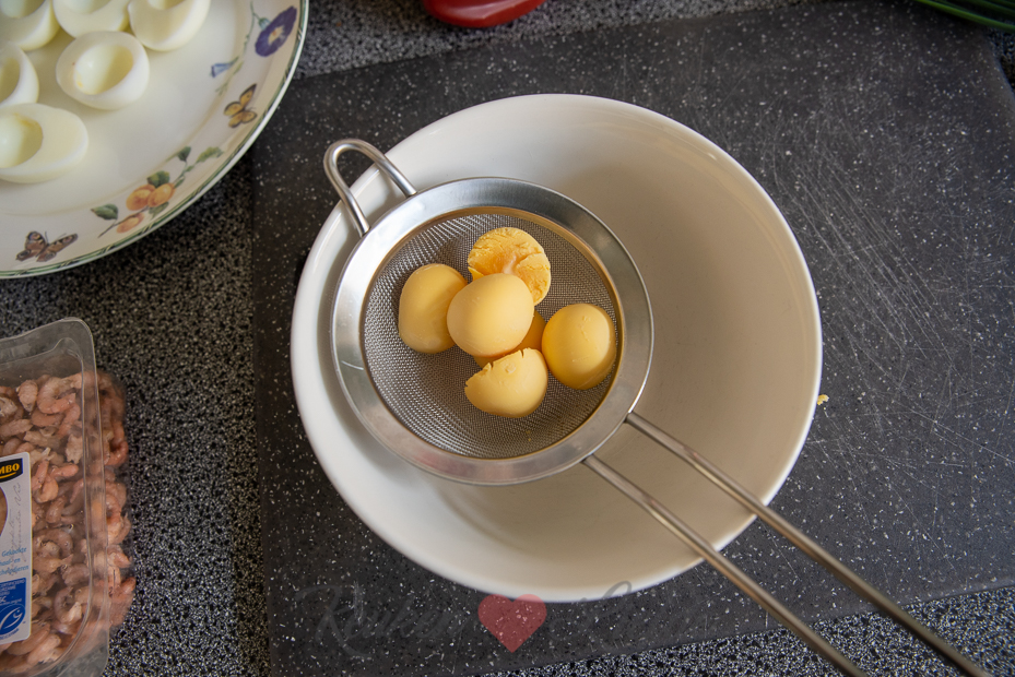Schep het dooiermengsel met een lepel in de eiholtes, je kunt hier ook een spuitzak met spuitmond voor gebruiken. Schep op elk ei wat Hollandse garnalen en bestrooi met de bieslook.