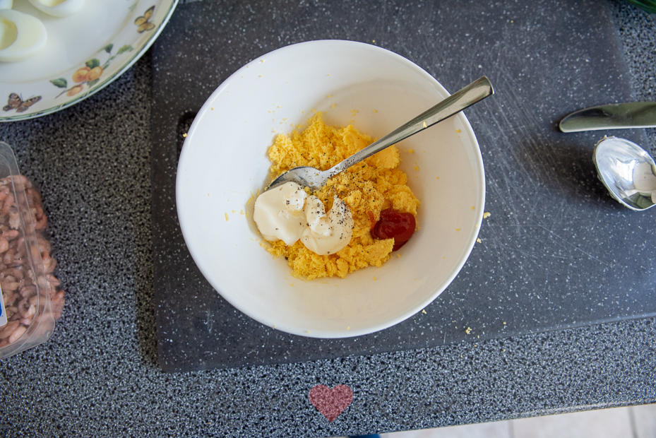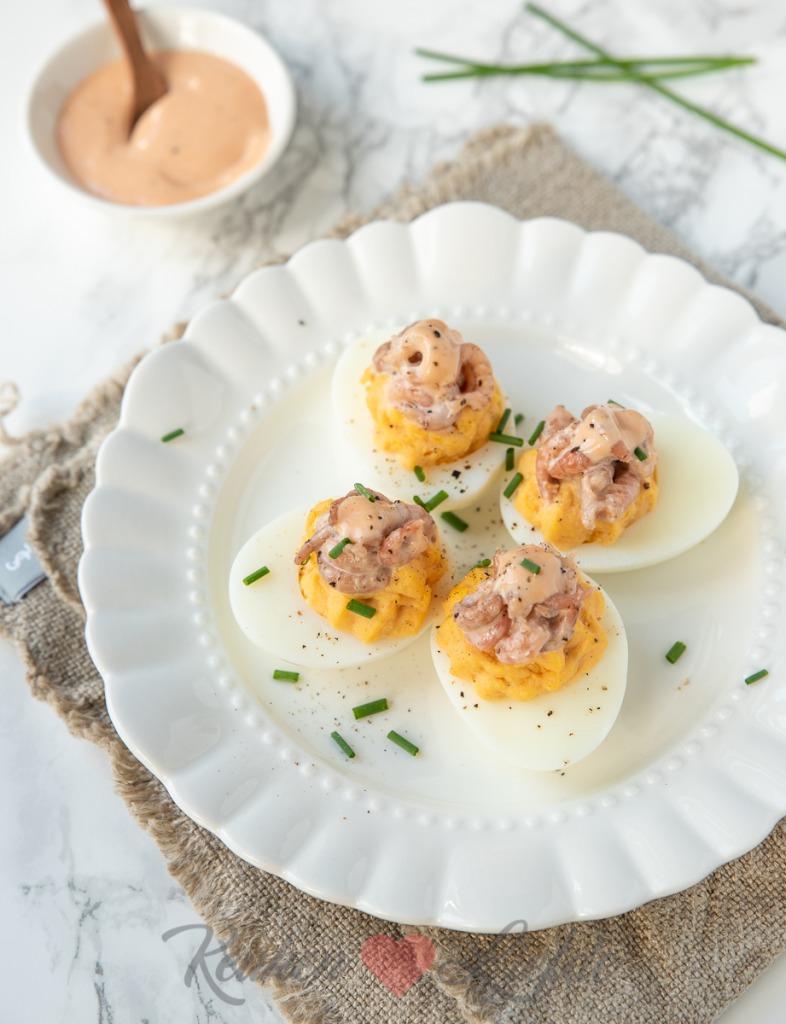 Roer in een kom de mayonaise, ketchup en citroensap door elkaar, breng op smaak met peper. Halveer de eieren en wip de dooier eruit. Prak de eidooiers fijn en meng met zoveel van de cocktailsaus tot een romige vulling. Roer de overige cocktailsaus (of een deel ervan) door de Hollandse garnalen.