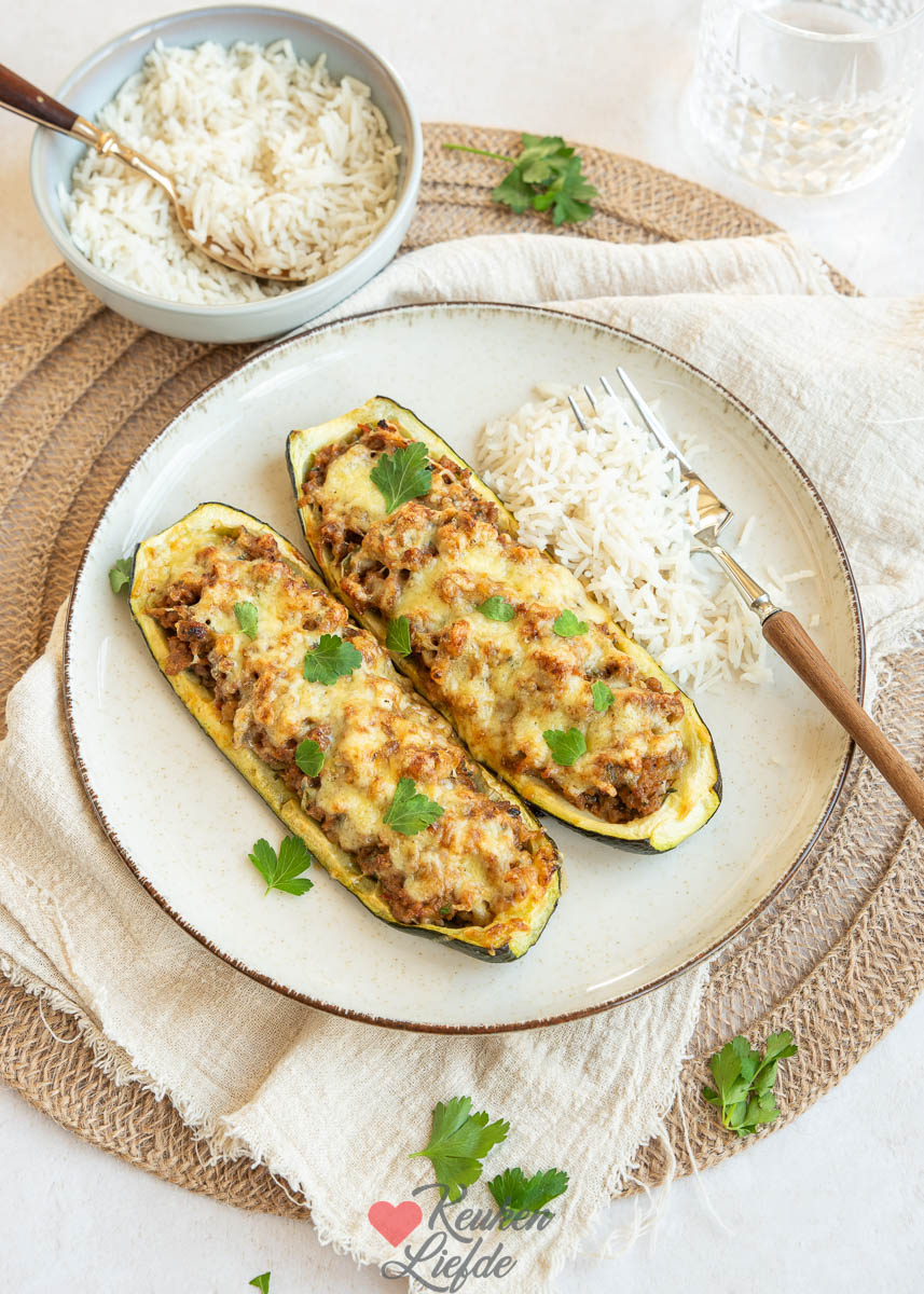 Gevulde courgette met gehakt en kaas gegratineerd in de oven. Lekker als lichte maaltijd met een salade erbij of serveer met rijst, pasta of aardappel.