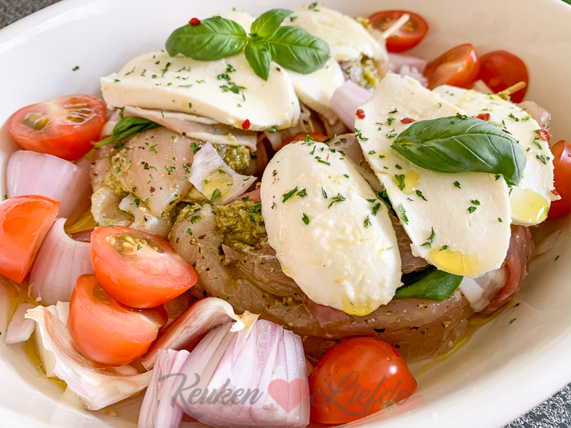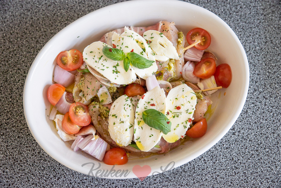 Bestrooi de kipfilets rondom met zout en peper. Snijd de kipfilets over de lengte tot halverwege in, zodat je ze kunt vullen. Vul de holte met een lepel pesto en een plakje mozzarella. Maak de holte dicht met een houten prikker. Omwikkel de kip met twee plakjes Parmaham. Leg de kipfilets in de ovenschaal. Bedek met de overige plakjes mozzarella.