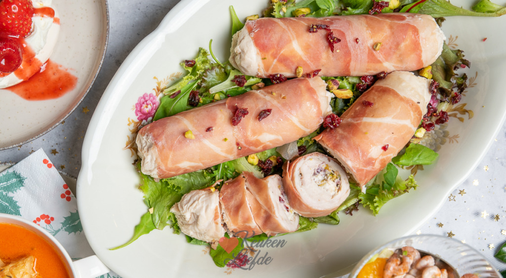 Note: Deze gevulde kiprollade is onderdeel van een klassiek 4-gangen kerstdiner. Zie hieronder. Het laatste recept deel ik a.s. zaterdag met je.