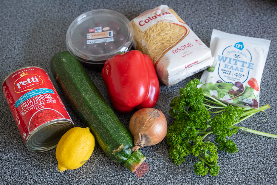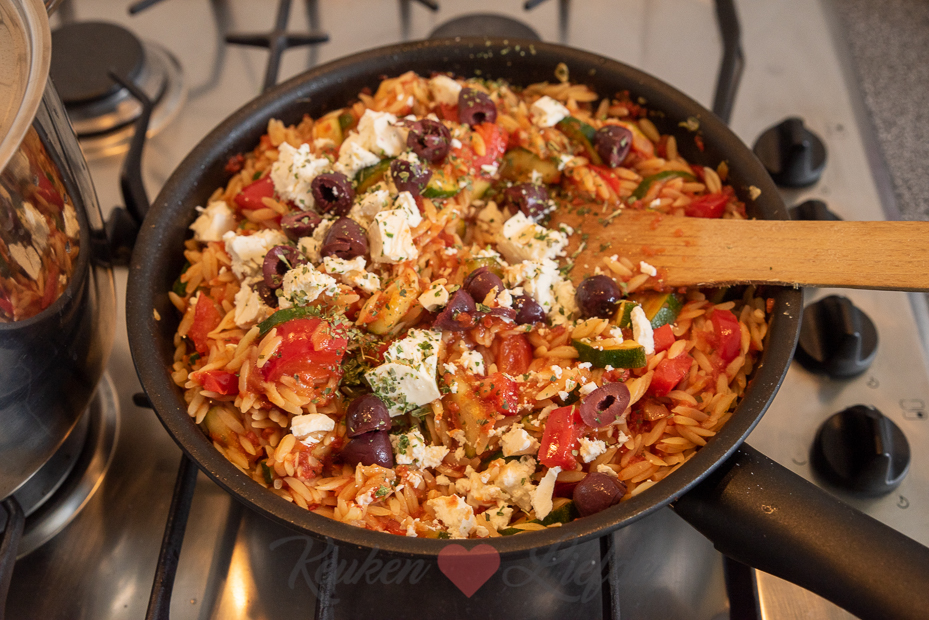 Giet de risoni af en laat uitlekken in een zeef. Voeg de risoni toe aan de tomatensaus en groenten en warm even door. Voeg de helft van de feta, olijven en citroensap (hoeveelheid naar eigen smaak) toe en roer door de risoni. Breng indien nodig verder op smaak met zout en peper. Schep de risoni op borden en garneer met de overige feta en olijven. Druppel voor de liefhebber wat extra vierge oijfolie over de risoni en bestrooi met wat extra oregano.