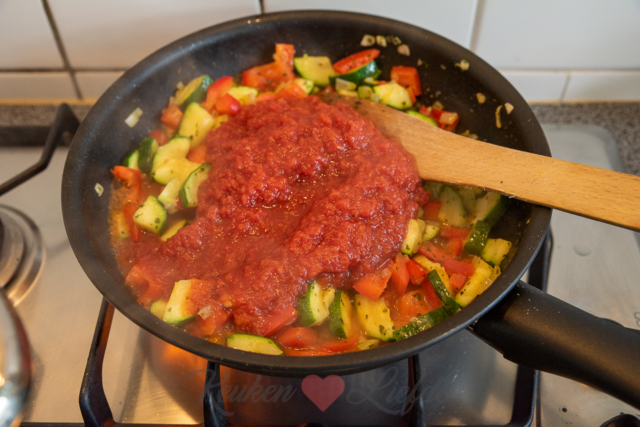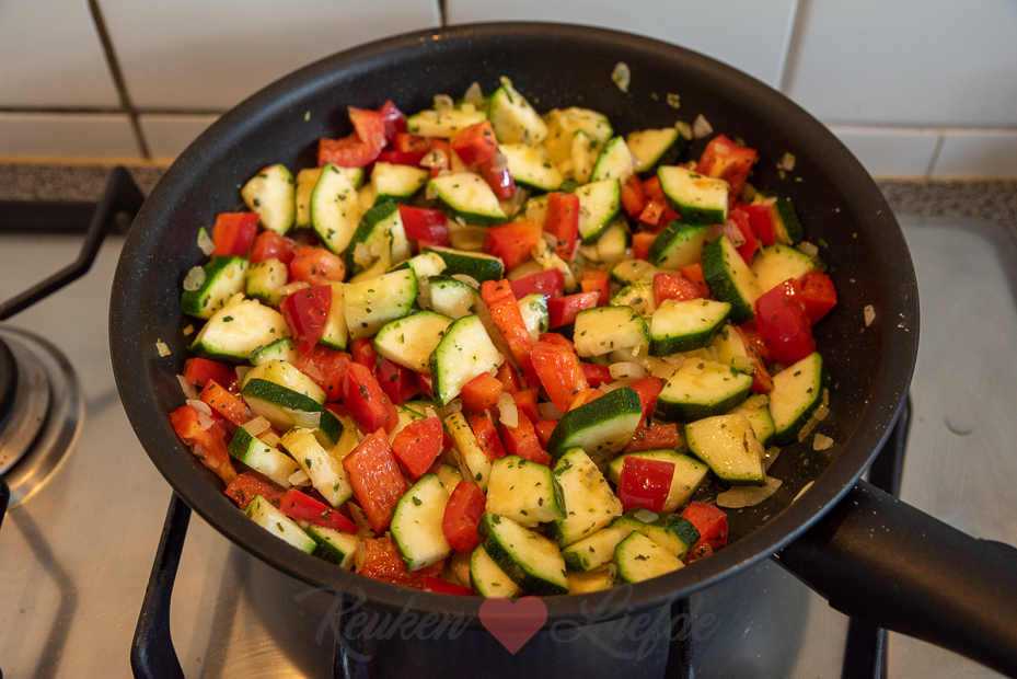 Verhit een koekenpan met een scheut olijfolie en fruit de ui op middelhoog vuur tot hij zacht en glazig is. Voeg de courgette, paprika, oregano en knoflook toe en breng op smaak met wat zout. Bak op middelhoog vuur verder tot de courgette en paprika wat zachter zijn en beginnen te kleuren. Voeg de tomatenstukjes toe en breng nogmaals op smaak met zout en peper. Laat de saus circa 5 minuten zachtjes pruttelen, tot de groenten beetbaar zijn.