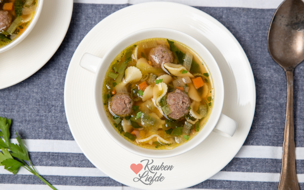 Een goedgevulde groentesoep met gehaktballetjes en pasta. Ik ga voor een makkelijke en snelle variant door de bouillon te maken van bouillontabletten en maak gebruik van gesneden soepgroenten.