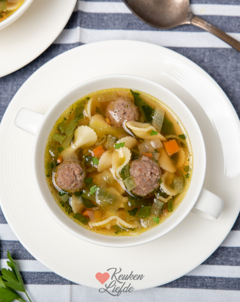 De gehaktballetjes maak ik van rundergehakt en breng ze op smaak met gehaktkruiden met uitjes. Die vind ik erg lekker. Het draaien van de gehaktballetjes is zo gebeurd. Door ook wat pasta aan de soep toe te voegen maak je er heel eenvoudig een heerlijke maaltijdsoep van.