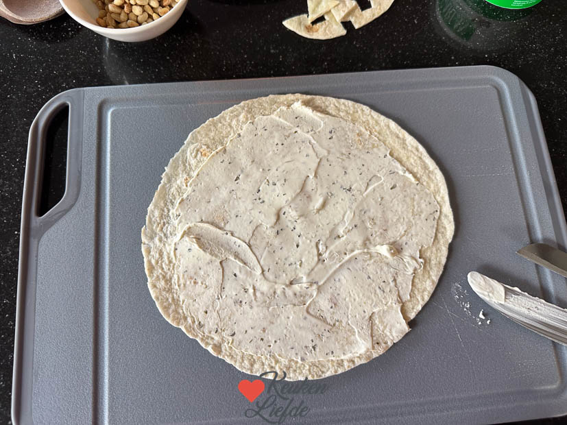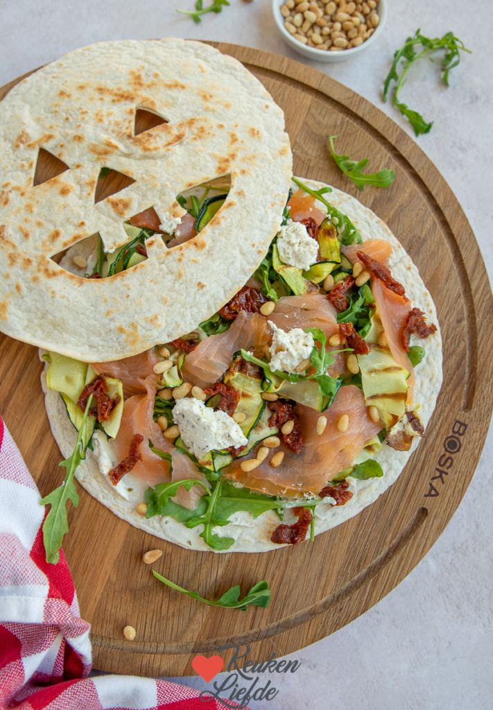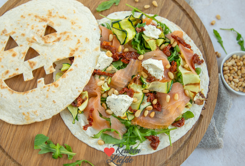 Heerlijke Halloween wraps belegd met roomkaas, gegrilde courgette, rucola en gerookte zalm. Perfect voor een griezelig Halloween feestje!