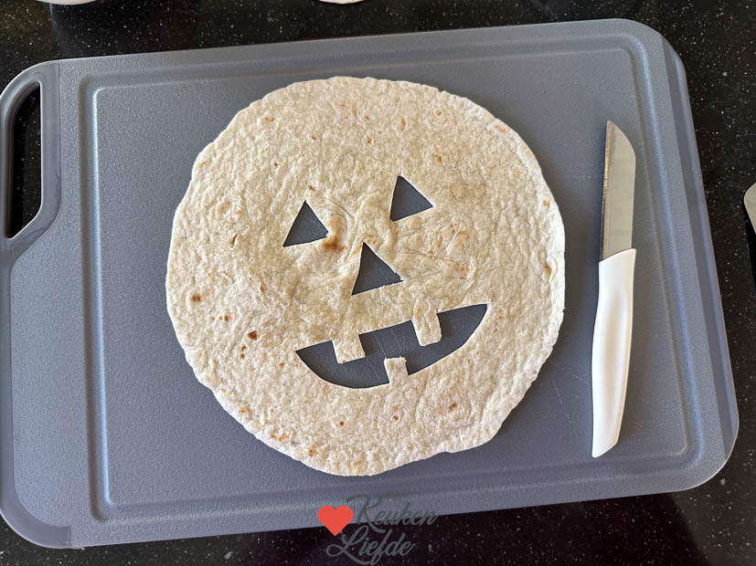 Deze Halloween wraps maak je heel eenvoudig door met een mesje ogen, een neus en een mond uit de wraps te snijden. De courgette kun je grillen in een grillpan voor mooie grillstrepen, of bakken in een koekenpan tot hij een kleurtje krijgt en beetgaar is.