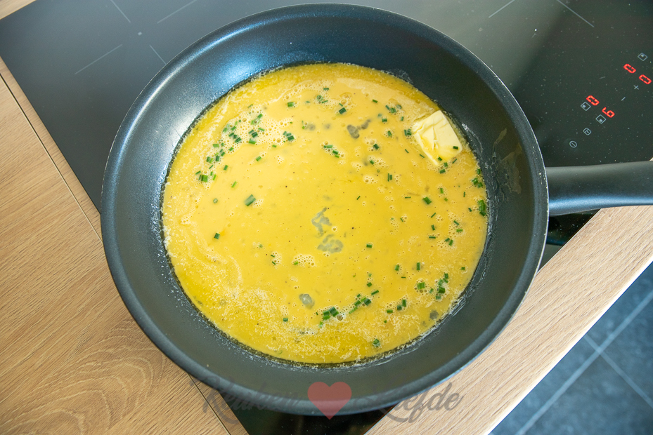 Verwarm de oven voor op 180 graden. Klop de eieren los. Giet een klein beetje ei in een beker om te bestrijken. Breng de eieren op smaak met zout en peper uit de molen en roer de helft van de bieslook erdoor.