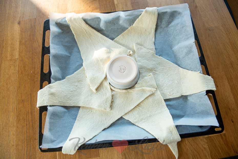 Rol het croissantdeeg uit en snijd de driehoeken los. Leg een rond glas of schaaltje op het midden van de bakplaat. Leg het deeg iets overlappend in een stervormige cirkel om het glas, met de punten naar buiten. Verwijder het glas.