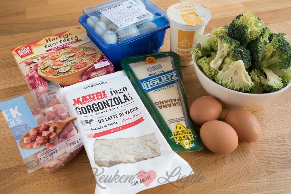 Klop de crème fraîche, eieren en de helft van de parmezaan los met wat peper en zout. Niet teveel zout want de spekjes zijn ook zout. Giet het eimengsel over de groenten. Bestrooi met de overige parmezaan en verdeel de gorgonzola over de taart.