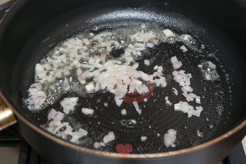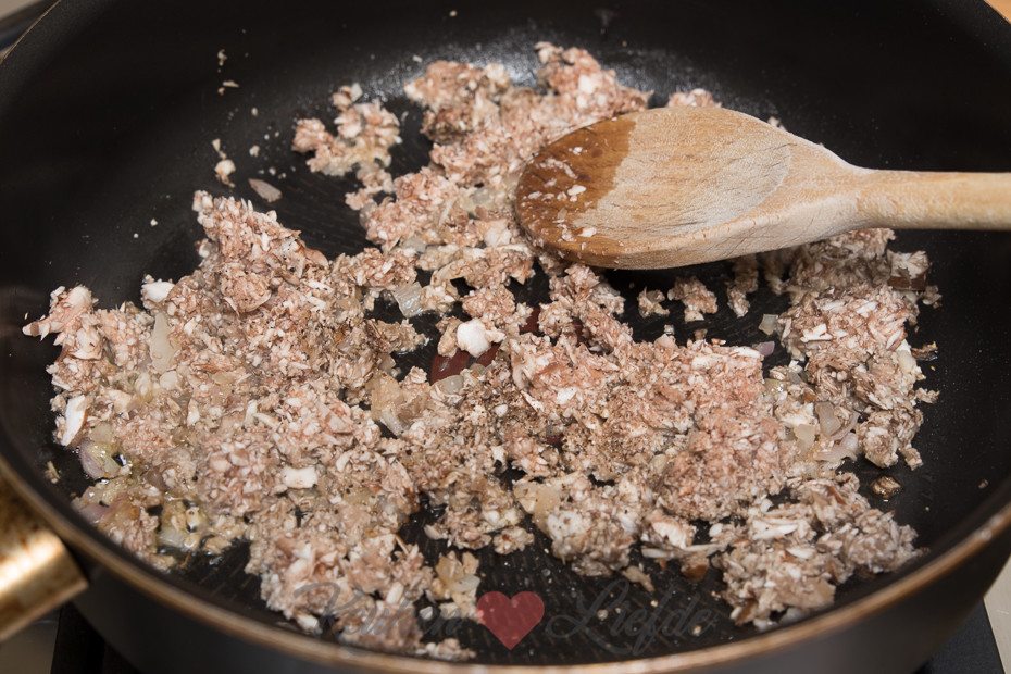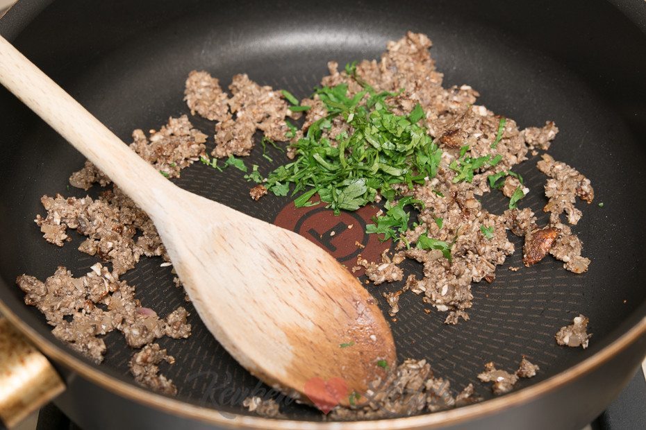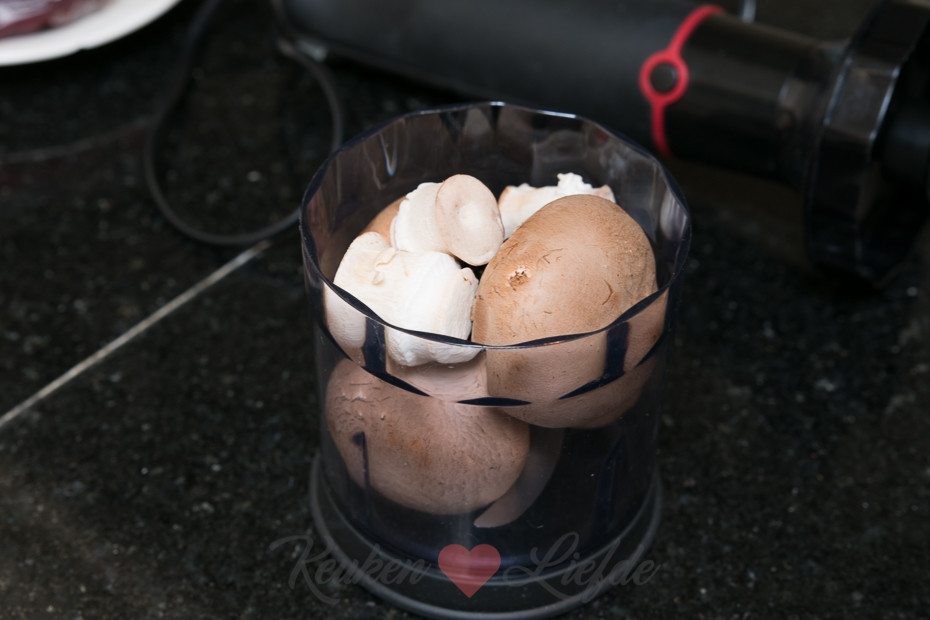 Voeg indien nodig een extra klont boter toe aan het bakvet in de koekenpan en fruit de sjalot en knoflook op laag vuur zacht. Maal ondertussen de champignons fijn in de keukenmachine en voeg toe aan de sjalot. Breng op smaak met zout en peper. Zet het vuur hoog en bak al roerend verder totdat al het vocht uit de champignons verdampt is. Schep het champignonmengsel op een bord en laat afkoelen.