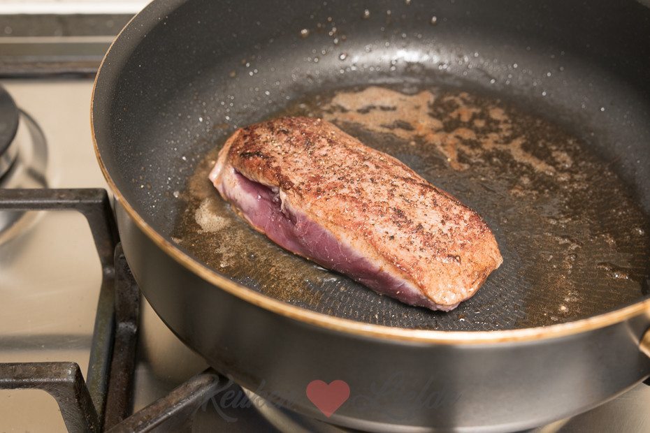 Bestrooi de hertenbiefstukje met zout en peper. Laat een koekenpan heet worden en smelt hierin een klont boter. Bak de hertenbiefstukjes in een (loei)hete koekenpan kort aan beide kanten, alleen om te laten kleuren. De biefstukjes mogen niet gaar worden, dus hoe korter je ze bakt, hoe beter! Leg de biefstukjes op een bord en zet in de koelkast om af te koelen.