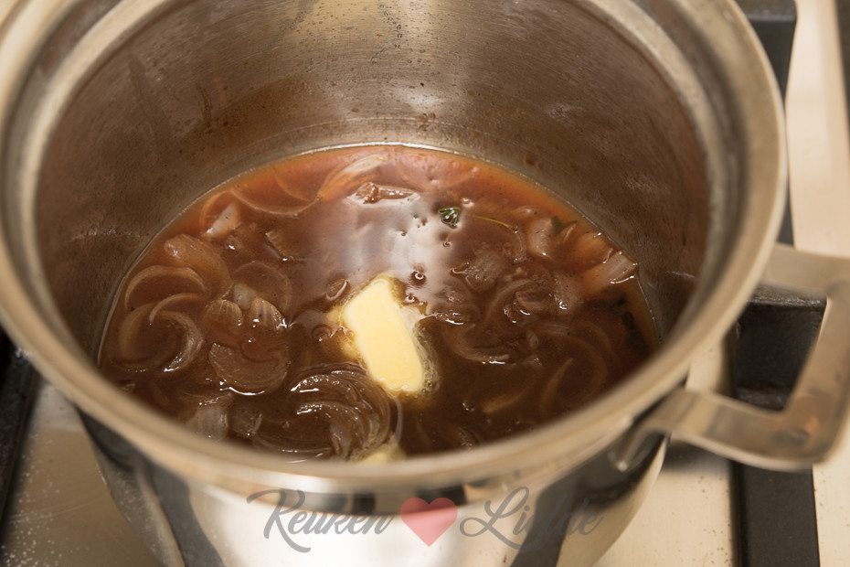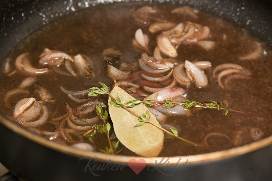 Verwarm ondertussen de wildsaus en klop de vlokjes roomboter erdoor. Hierdoor gaat de saus mooi glanzen. Verwijder de laurier en tijm.