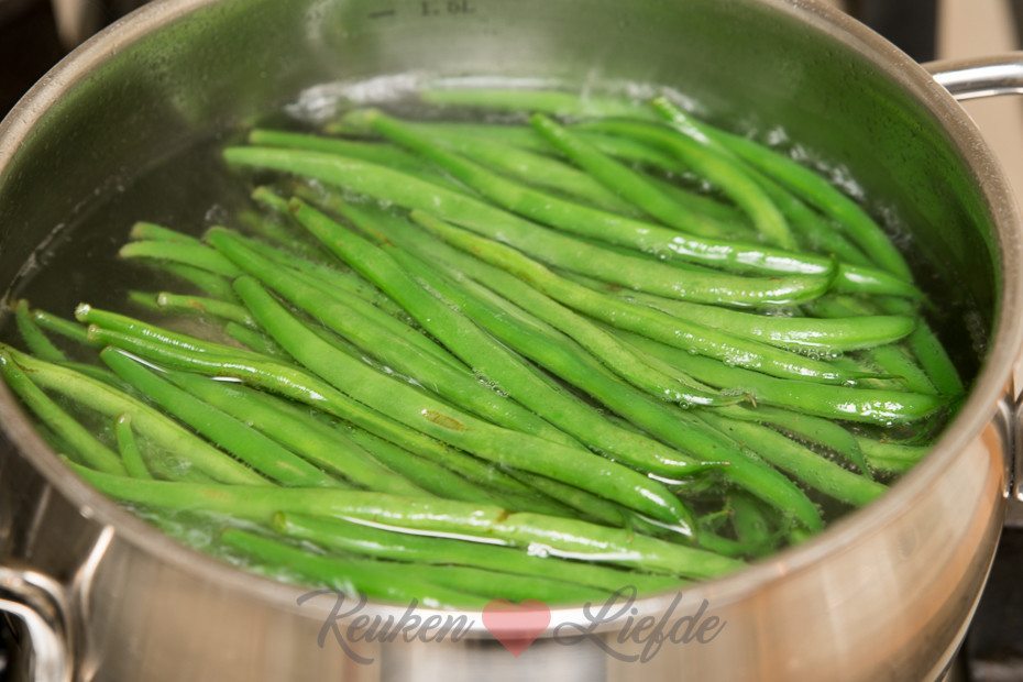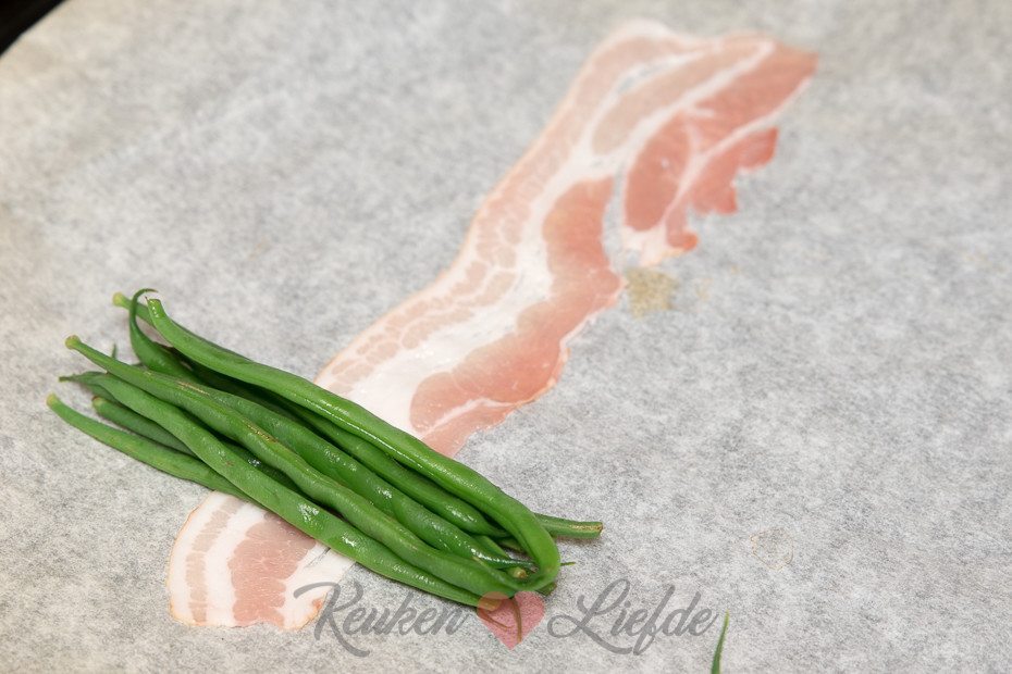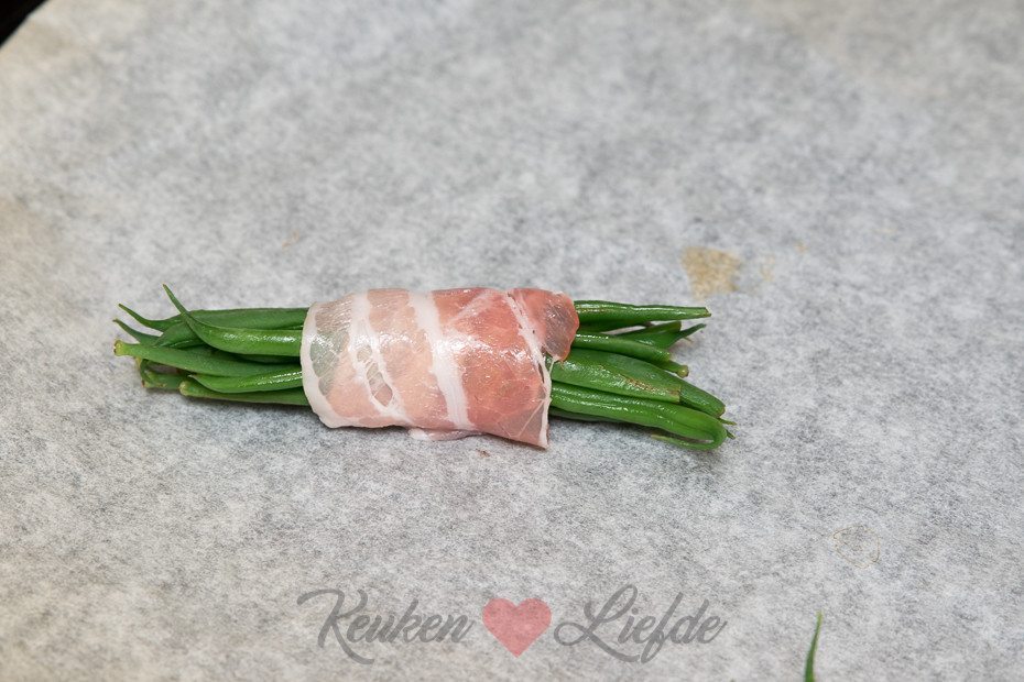 Kook de haricots verts circa 1,5 minuut in een pan met kokend water. Spoel af met koud water en laat ze uitlekken. Maak bundeltjes van 12 tot 14 haricots verts en rol ze op in een plakje spek. Leg ze op een met bakpapier bekleed bakblik. Tip: dek de uiteinden van de haricots verts af met alufolie om te voorkomen dat ze zwart kleuren in de oven. Als je de rolletjes in een koekenpan bakt, hoef je ze niet af te dekken. (Zijn de uiteinden van de haricots verts alsnog verbrandt in de oven? Knip ze er dan af met een schaar!)