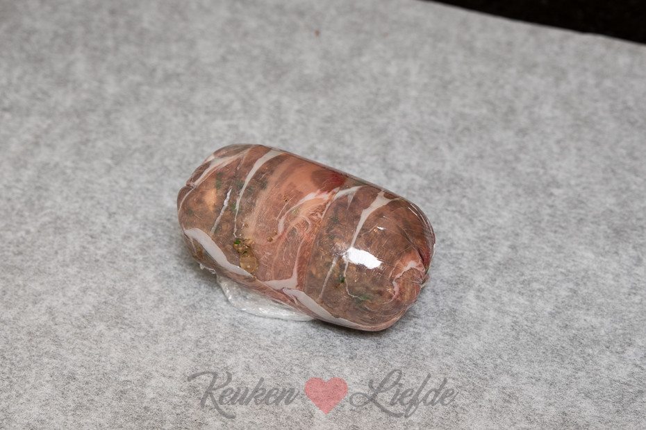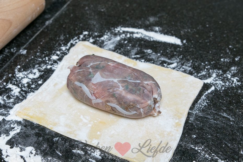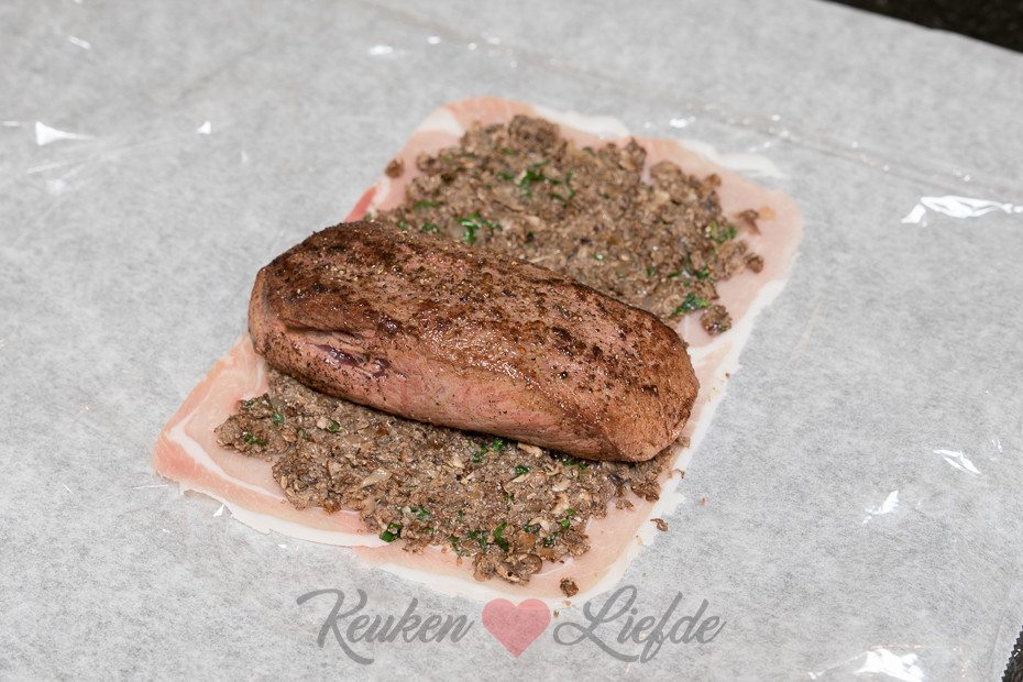 Bekleed een stuk vershoudfolie met 2 plakken serranoham. Zorg dat ze elkaar iets overlappen. Bestrijk de ham met 1/4 van het champignonmengsel en leg er een biefstukje bovenop. Rol de biefstuk op in de ham en wikkel in het vershoudfolie. Rol zo strak mogelijk op door de uiteinden als een toffee dicht te draaien. Knoop de uiteinden aan elkaar vast. Leg de wellingtons 10 minuten in de diepvries.
