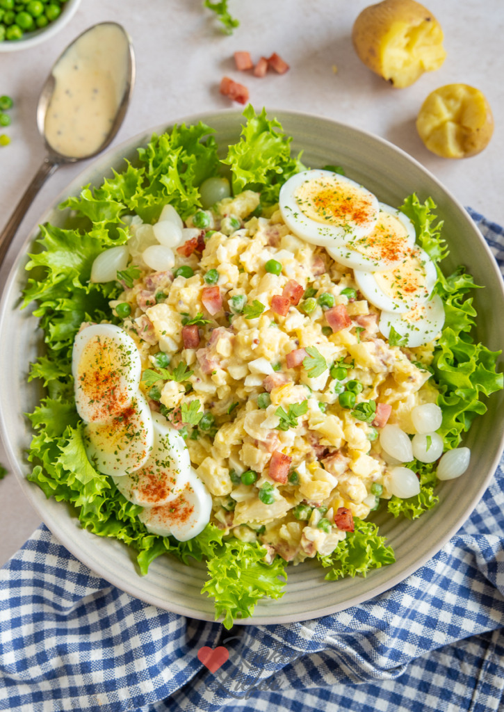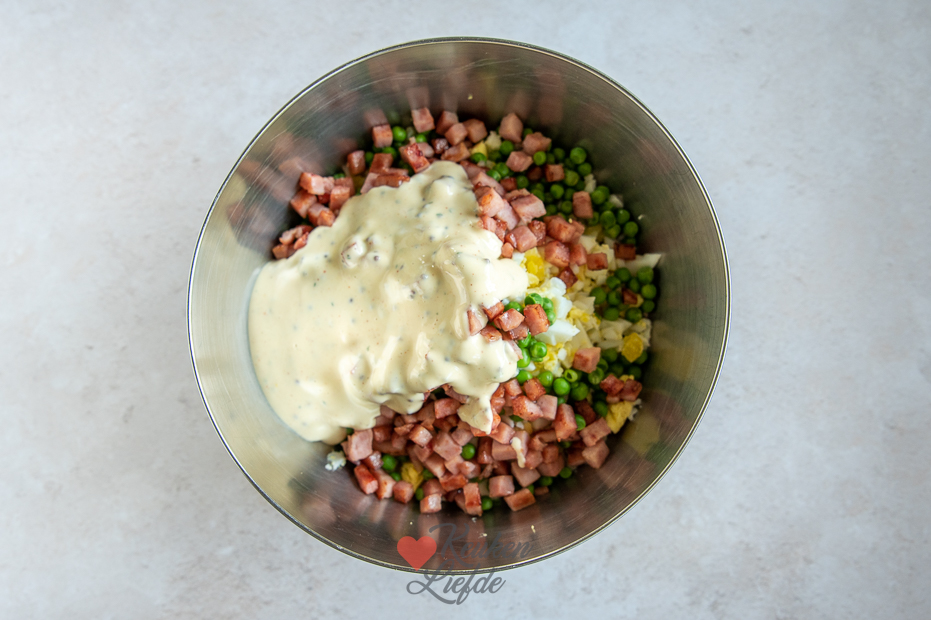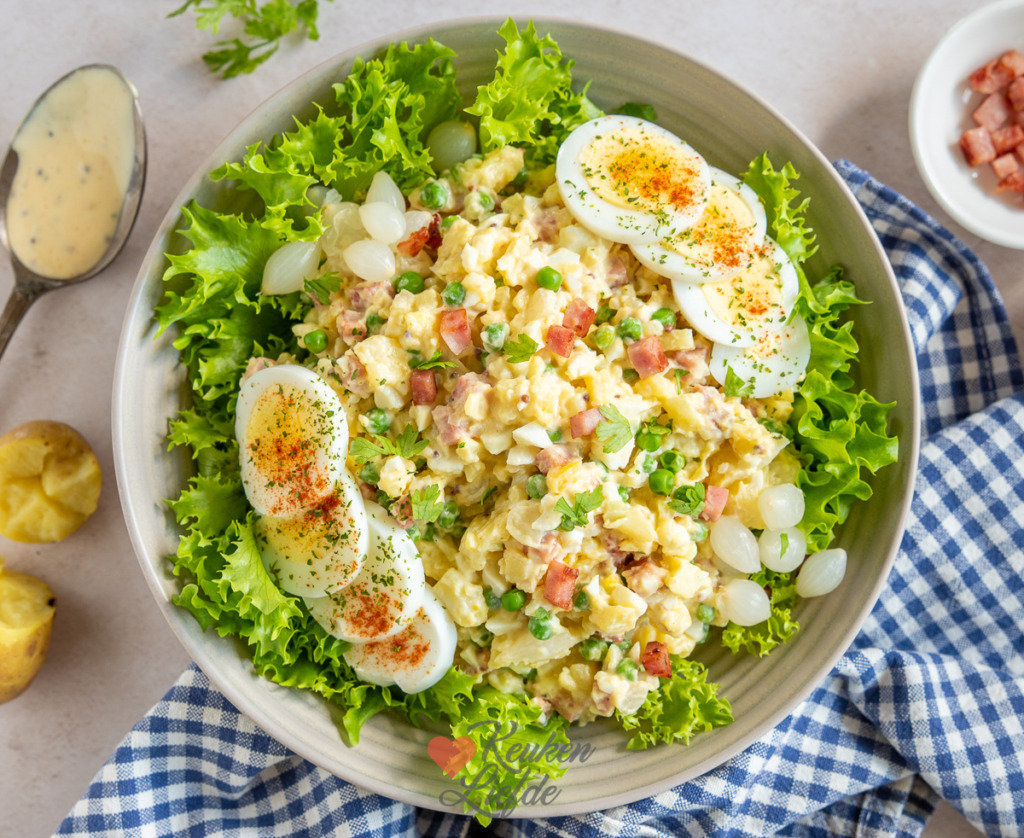 De lekkerste huzarensalade koop je niet kant-en-klaar in de winkel maar maak je lekker zelf. Hij mag niet ontbreken bij de barbecue, maar smaakt eigenlijk overal lekker bij. Deze huzarensalade met ham en ei is makkelijk om te maken en verrukkelijk. Naast ham en ei zitten er ook doperwtjes en zoetzure zilveruitjes in voor een frisse smaak en knapperige bite.