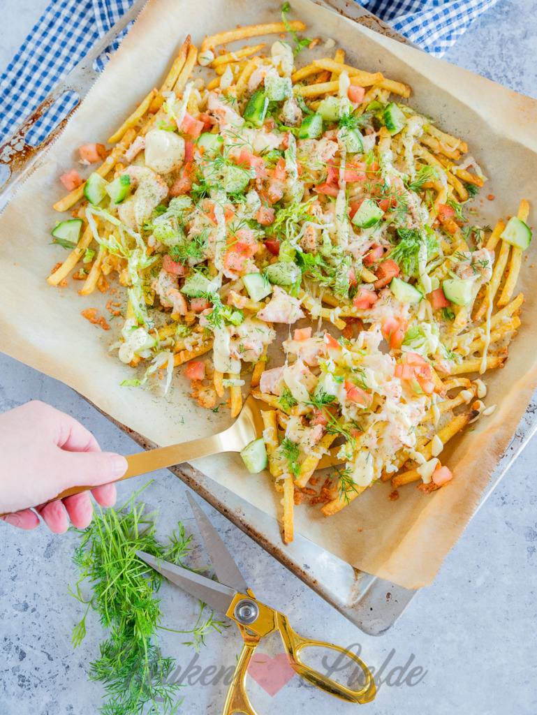 Een makkelijk gerecht uit de oven, ik hou ervan! Deze kapsalon met zalm van het bakblik zet je in 20 minuten op tafel. Het is een echte familiefavoriet, iedereen is er dol op. Maak het af met verse salade en knoflooksaus!