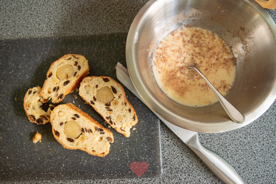 - Scheut melk (hoeveelheid hangt af van hoeveelheid brood, moet genoeg zijn om al het brood in te weken)