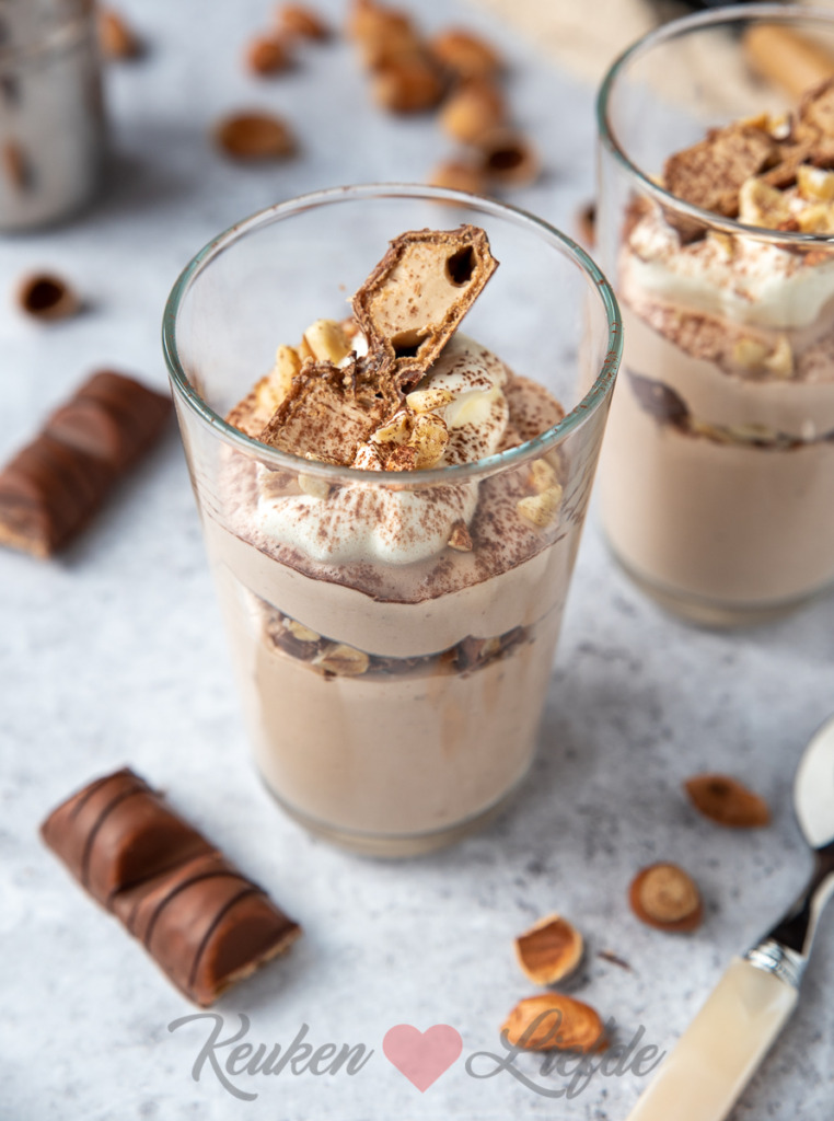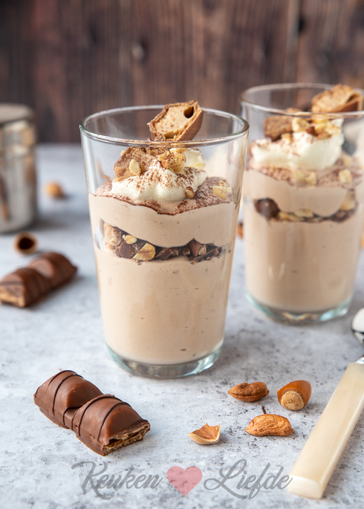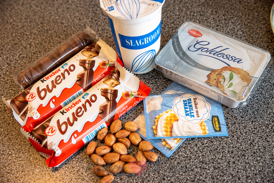 Hoi Iris, je hebt gelijk! Ik heb de foto verwijderd om verwarring te voorkomen. Je kunt de Kinder Bueno beter niet door de mousse spatelen omdat hij dan zacht wordt.
