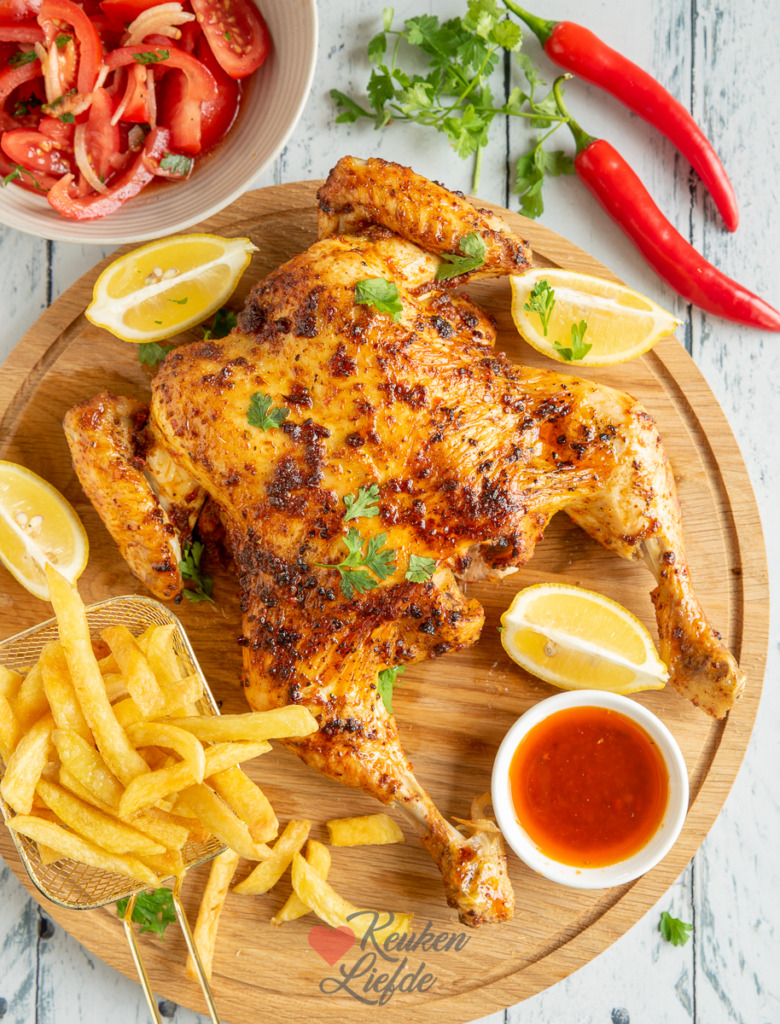 Deze Portugese kip piri piri maak je heel eenvoudig in de oven. Ik serveer hem met een frisse tomatensalade en frietjes maar rijst of brood smaken er ook heerlijk bij.