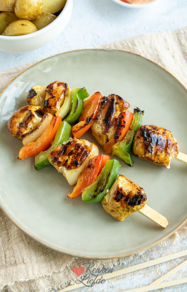 Veeg de overtollige yoghurt van de kip af en rijg de kip om en om met de paprika en ui aan spiesjes.