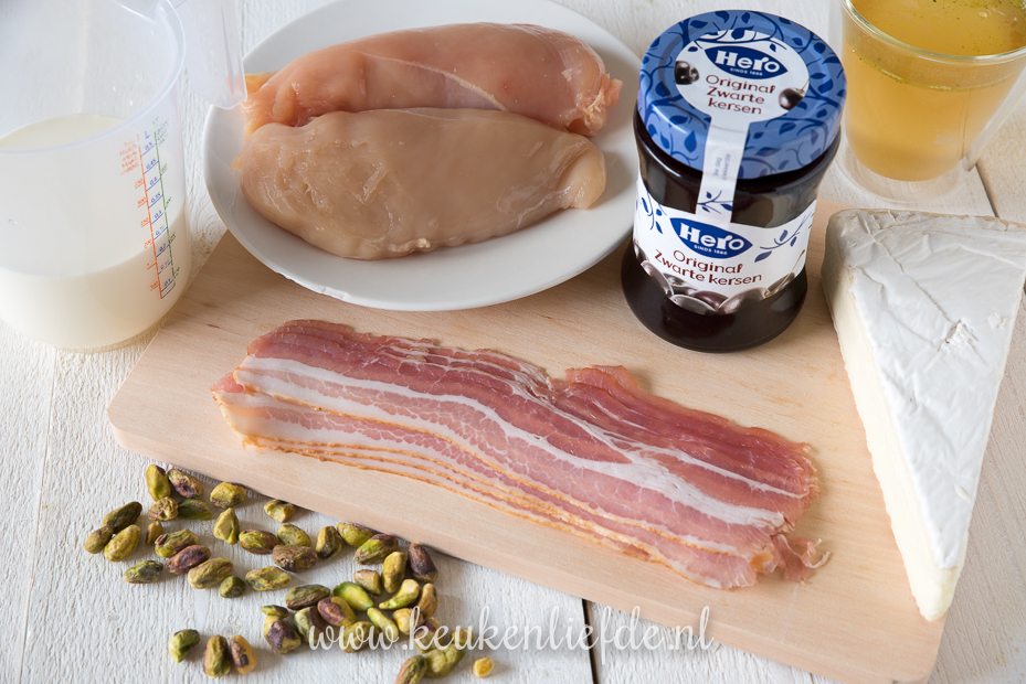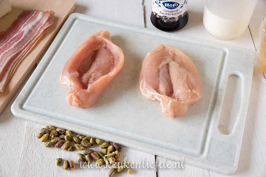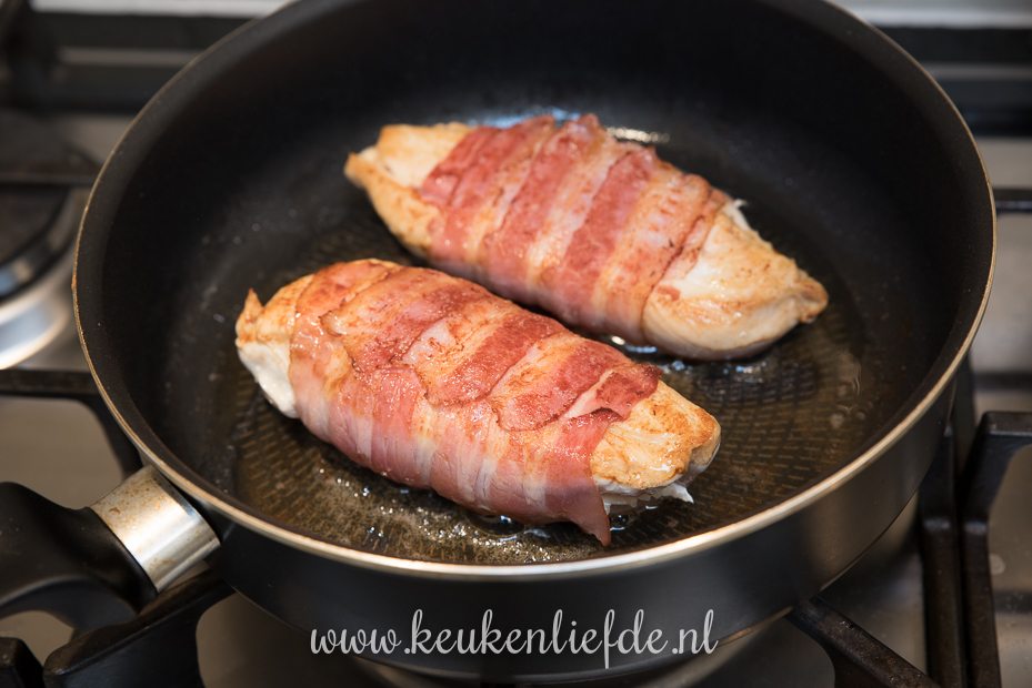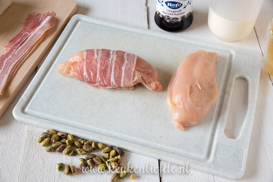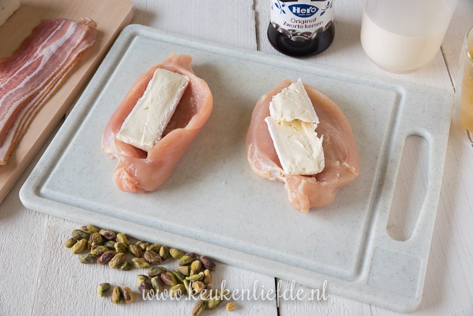 Snijd de kipfilets over de lengte open en vul met de roombrie. Klap de kipfilets weer dicht en omwikkel de kipfilets met ontbijtspek.
