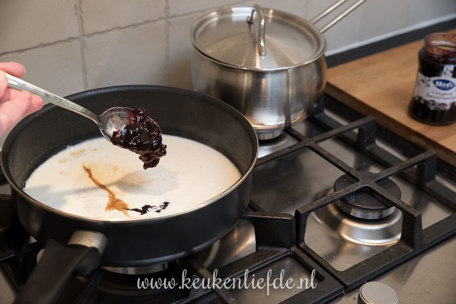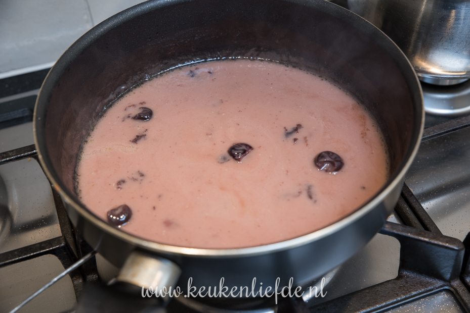 Blus de koekenpan met het bakvet af met de kippenbouillon, room en kersenjam. Breng aan de kook en zet het vuur lager. Kook zachtjes verder totdat hij is ingekookt tot sausdikte. Houd de saus warm op laag vuur.