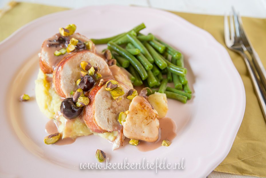 Dit keer was het een schot in de roos. Ik serveerde kipfilet gevuld met romige brie en omwikkeld met spek, geserveerd met pistachenoten en kersensaus. Lekker op een bedje van aardappelpuree en gekookte sperziebonen. Het was een tijd stil aan tafel, maar daarna brak het gesprek los. Joehoe, missie geslaagd!