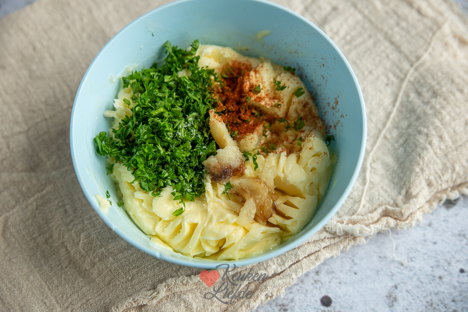Zelf kruidenboter maken is iets wat ik regelmatig doe. Het is makkelijk en leuk en veel lekkerder dan kant-en-klaar gekocht in de winkel. Deze knoflookboter met gepofte knoflook is heerlijk! Door de knoflook in de schil in de oven te poffen verdwijnt de scherpe knoflooksmaak en blijft er een zachte, zoete smaak over. Serveer deze knoflookboter op de borrelplank met knapperig brood, of gebruik hem voor deze heerlijke knoflookbroodjes.