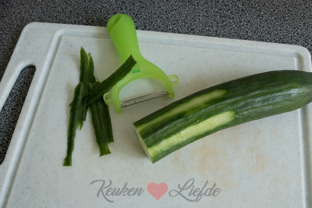 Schil de komkommer om en om met een dunschiller en snijd in plakken. Hak de dille fijn. Beleg de plakken komkommer met een theelepel roomkaas en een stukje gerookte zalm. Garneer met de dille en bestrooi met wat versgemalen zwarte peper.