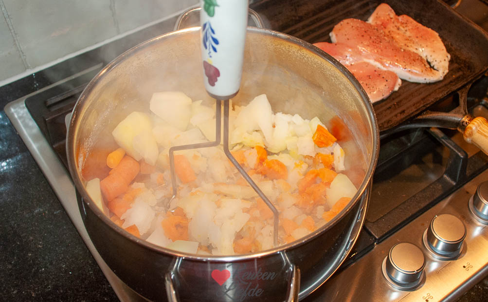 Koolrabistamppot met honing-mosterdkip – Eigenlijk was ik van plan om een salade te maken met de twee prachtige koolrabi exemplaren die ik kocht, maar toen ik afgelopen dinsdag een stamppotpakket kreeg thuisgestuurd, besloot ik de boel om te gooien. Stamppot was alweer even geleden en één blik op het prachtige boerenbontservies was genoeg om me over de streep te trekken.
