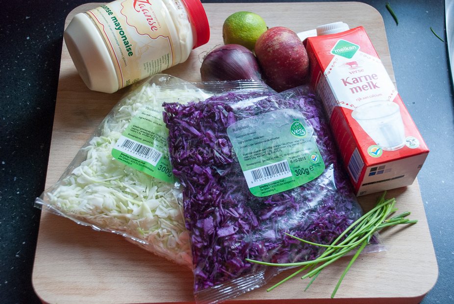Ik maak deze koolsalade met witte en rode kool. Witte kool is mild, lichtzoet en neutraal van smaak, rode kool is iets pittiger en heeft een aardse smaak. Ik vind het heerlijk om ze te combineren. Je kunt dit recept eventueel ook met alleen witte kool maken.