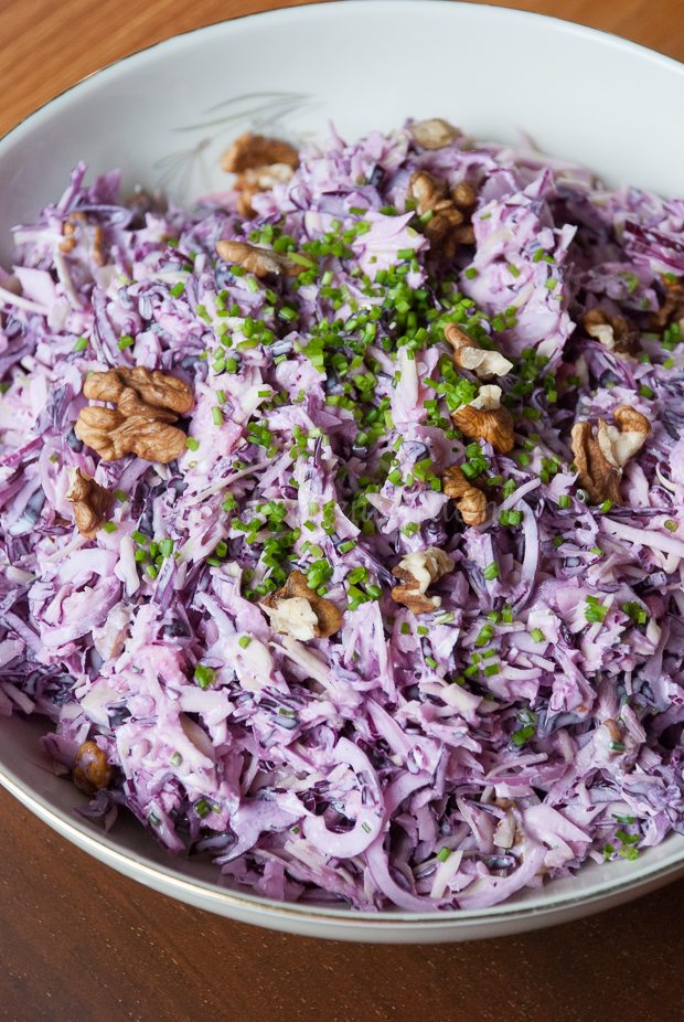Een heerlijke koolsalade met appel, walnoot en een frisromige dressing van karnemelk en mayonaise. De appel geeft een lekker fris accent en de walnoot een aangename crunch.