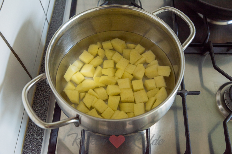 Kook de aardappelblokjes gaar in een pan met licht gezouten water. Giet ze af en laat even uitstomen.