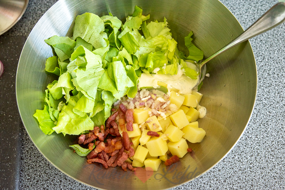 Doe de aardappels, het fijngehakte ei, uitgebakken spekjes (ook een klein beetje van het vrijgekomen spekvet ), sla en sjalot in een kom samen met een paar eetlepels slasaus. Hussel door elkaar. Schep in een mooie serveerschaal en garneer met de plakjes ei.