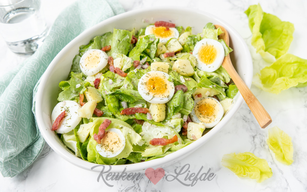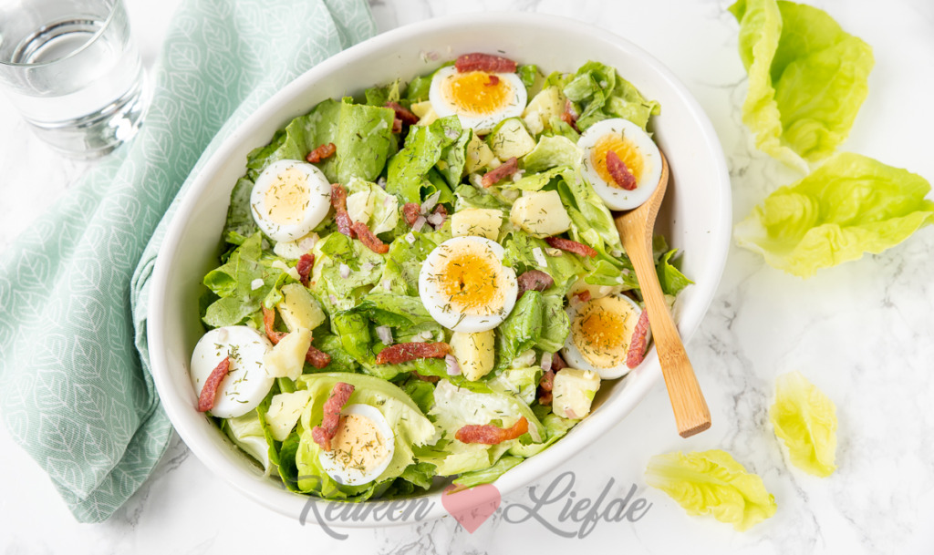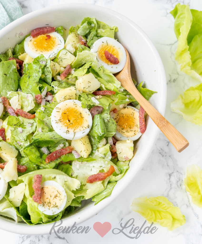Een heerlijke salade van kropsla, aardappel, ei en spekjes. De frisse en romige saladedressing maakt het smulfeest compleet! Lekker als onderdeel van een hoofdgerecht, of serveer bij de barbecue.