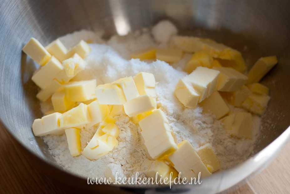 Doe 300 gram bloem, 145 gram suiker, 175 gram koude boter (in blokjes gesneden) en zout in een kom en kneed met je handen totdat er een kruimeldeeg ontstaat. Verdeel de helft van het kruimeldeeg over het bakblik en druk goed aan.