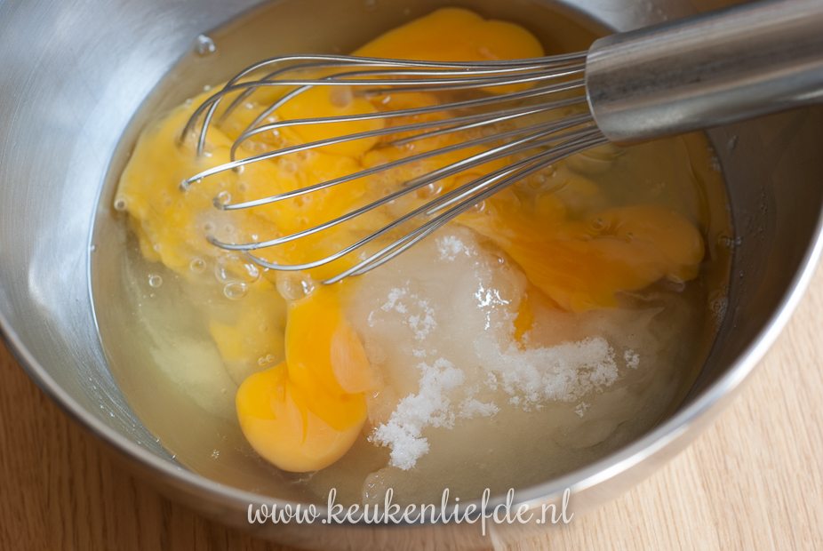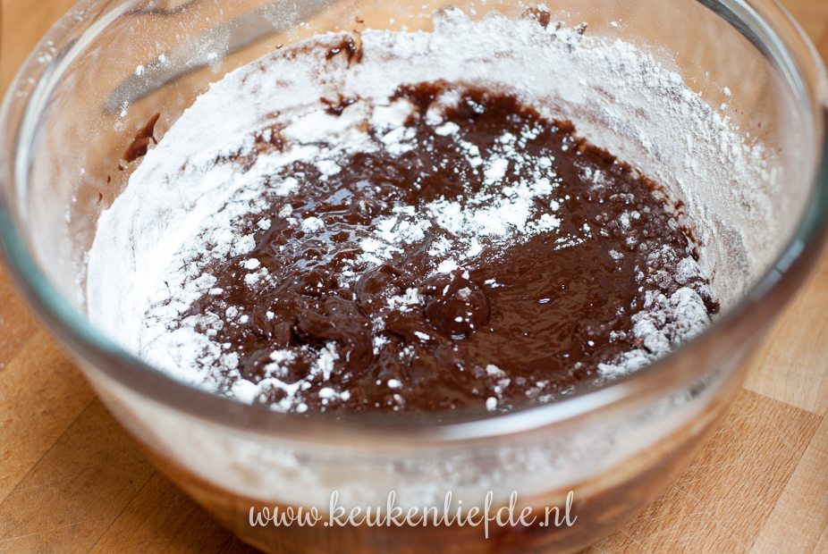 Klop de 4 eieren met de overige 190 gram suiker los en voeg al roerend het chocolademengsel toe. Zeef de overige 150 gram bloem erboven en spatel door het beslag.