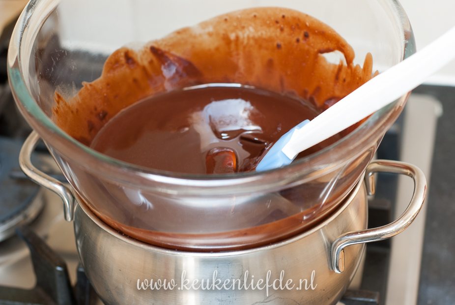 Doe de overige 250 gram boter en alle chocolade in een hittestendige kom en laat ze au bain-marie smelten. Haal van het vuur af en laat iets afkoelen.
