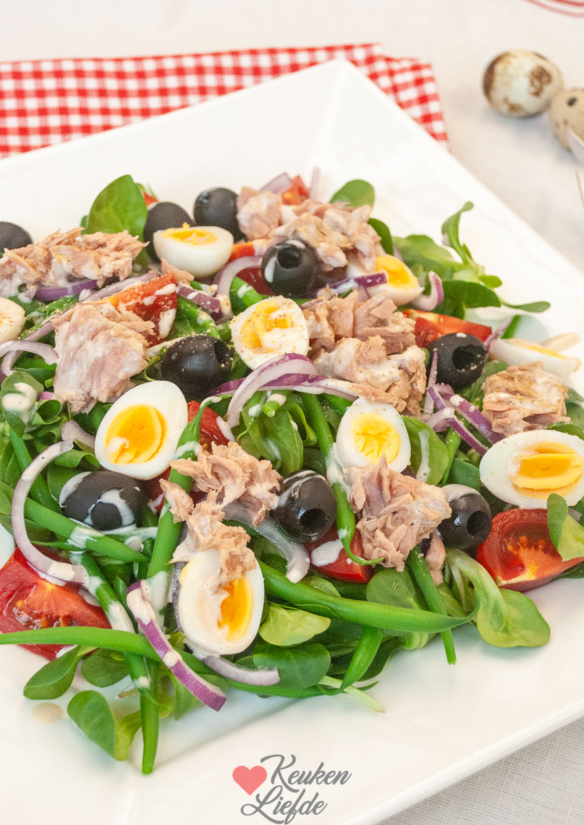 Goed, als een raket aan de slag met deze verwensalade vernoemd naar het pareltje aan de Franse kust Nice. Er zijn ontelbaar veel varianten op dit recept. Dit is mijn smulversie met elegante haricots verts en feestelijke kwarteleitjes. (Stiekem ook een heerlijk paasrecept!) Gebruik het liefst verse tonijn – om en om even kort grillen –, hoewel goede tonijn uit blik ook heerlijk is. Naar wens voeg je nog gekookte (kriel)aardappeltjes toe. Maak er een mooi feest van!