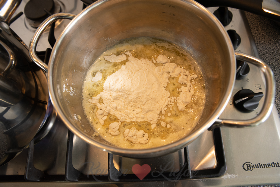Smelt de boter in een pan en voeg de bloem toe. Verkruimel de bouillontablet erover. Bak al roerend 5 minuten op laag vuur om te bloem te laten garen. Voeg langzaam en al roerend de melk toe en breng aan de kook. Zet het vuur dan lager en roer net zolang tot je een gebonden, gladde saus hebt. Voeg 50 gram van de geraspte kaas toe en laat smelten in de saus. Laat de saus 1 minuut zachtjes pruttelen.