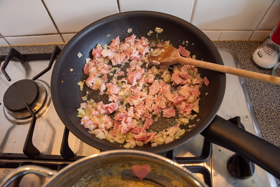 Verhit een koekenpan met een scheutje olijfolie en fruit de sjalot op middelhoog vuur 1 minuut. Voeg de pancetta toe en bak op middelhoog vuur tot de pancetta en ui beginnen te kleuren.