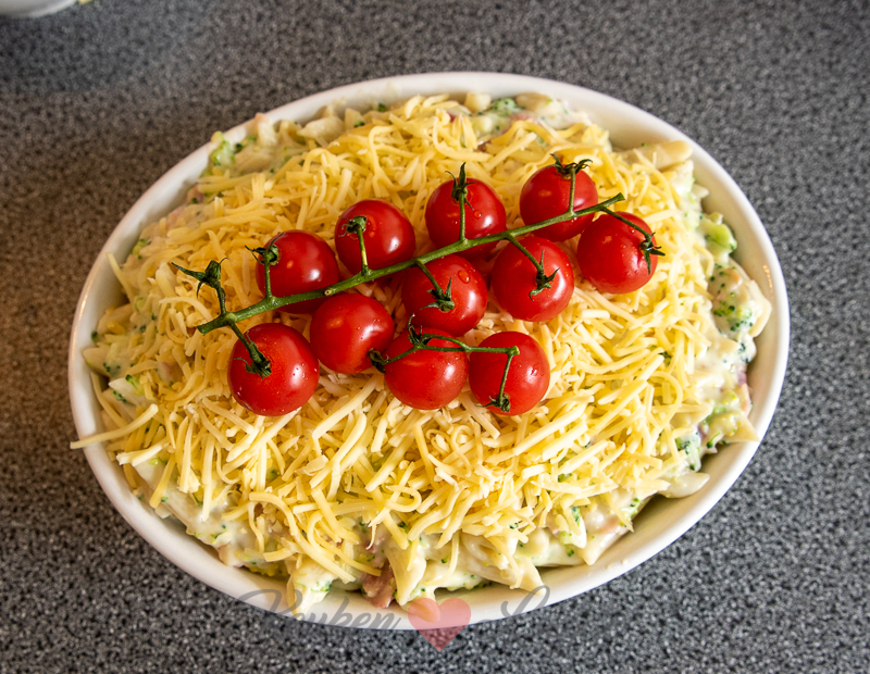 Verdeel de pasta over de ovenschaal. Bestrooi met de overige geraspte kaas. Leg de trostomaatjes erbovenop.