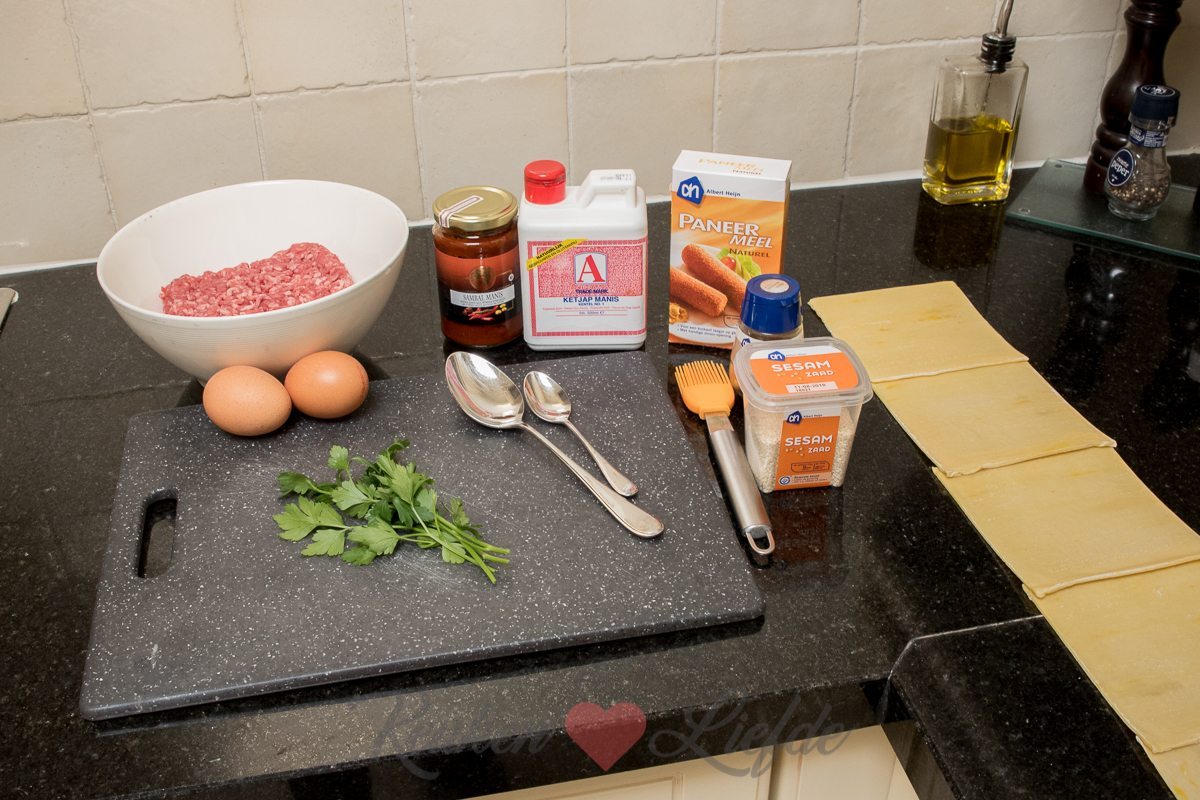 Kneed het gehakt in een kom met de sambal, ketjap, nootmuskaat, 1 ei en paneermeel, totdat het goed gemengd is.