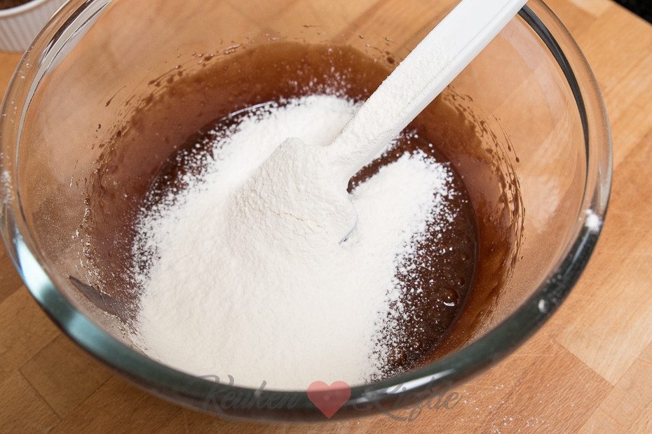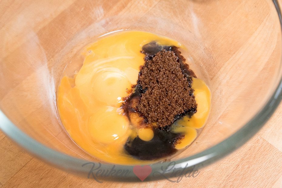 Houd 2 eieren apart en spits de andere eieren. Doe de eidooiers in een kom. De eiwitten heb je niet meer nodig, maar kun je gebruiken voor een ander recept zoals deze kerstpavlova. Breek de 2 losse eieren boven de kom en voeg de 100 g suiker toe. Voeg de gesmolten chocolade toe en klop alles goed door elkaar. Zeef de bloem boven de kom en spatel door het beslag.